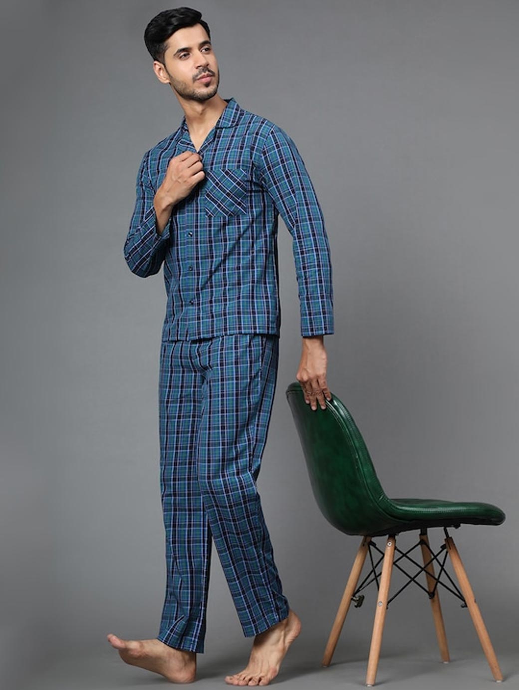 Men Blue Checked Night suit