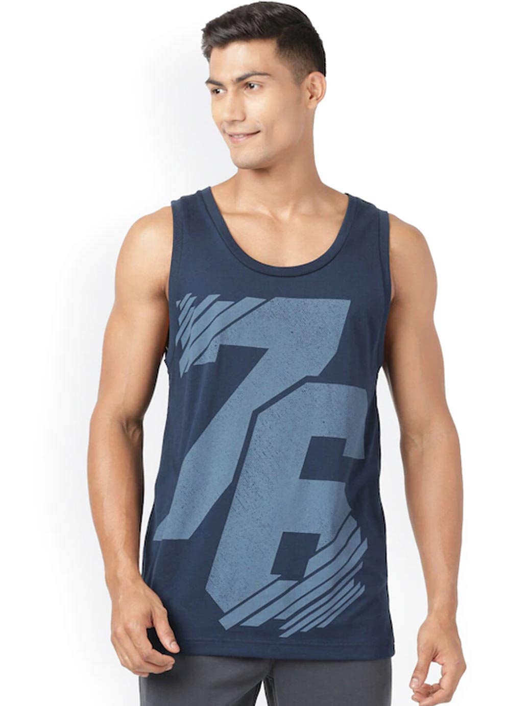 Navy Blue Printed innerwear gym vests, has a round neck and sleeveless