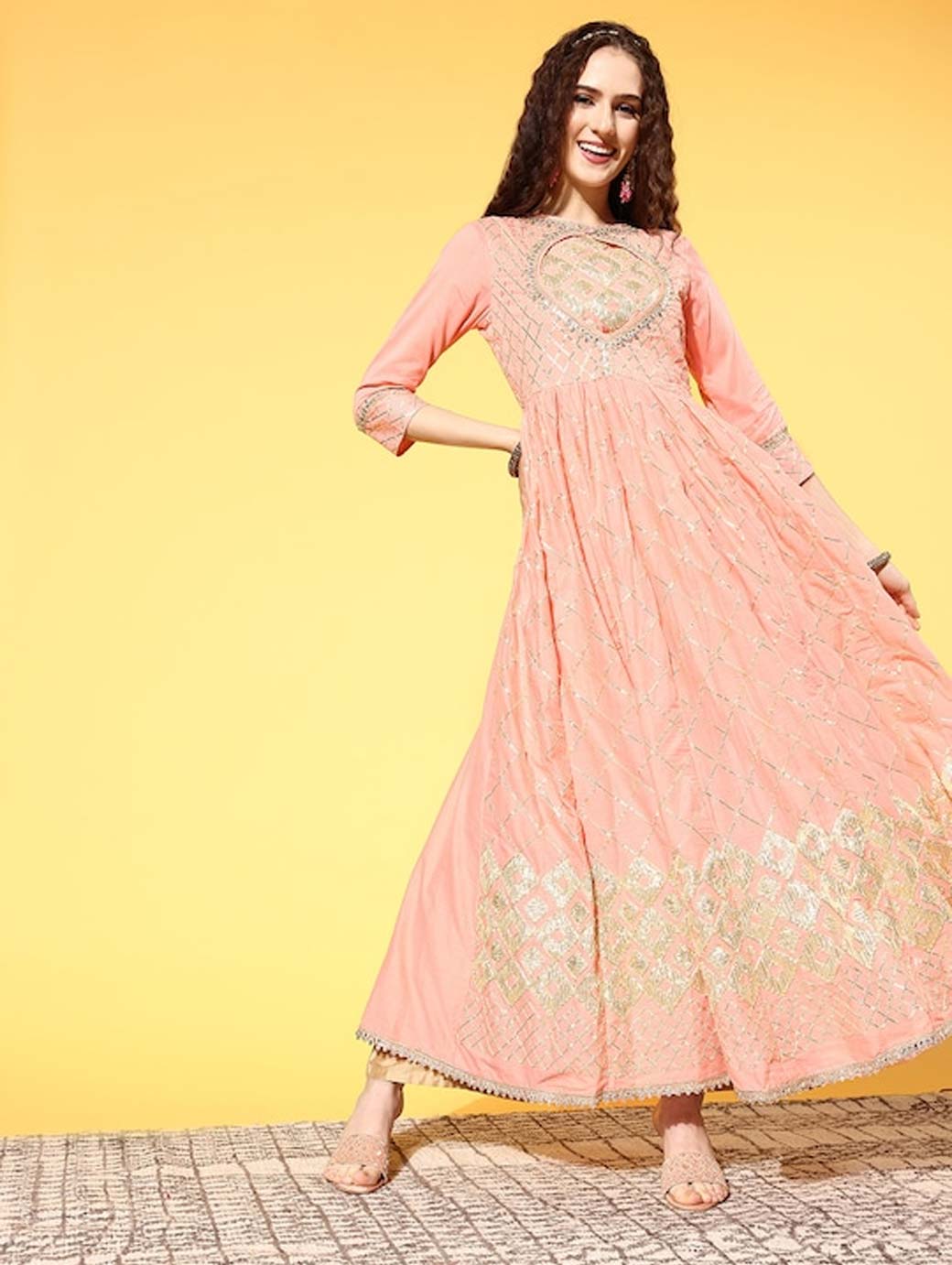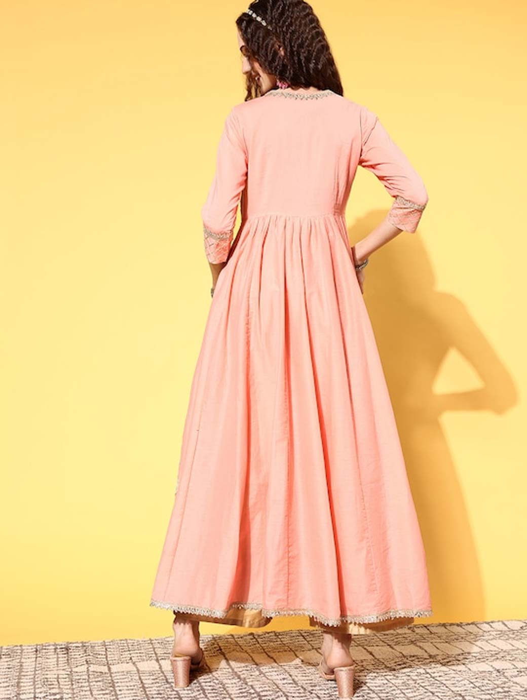 Infuse graceful charm into your ethnic collection with this alluring kurta. It sports lovely three-quarter regular sleeves and a classy flared hemline to lend a gorgeous look. Beautiful peach shade Three-quarter regular sleeves Flared hemline Ankle length Cotton, dry clean Trend Alert Ensembles adorned with glittery embellishments, like sequins or metallic sheen, to lend you a festive vibe. They are paired with uber-stylish detailing, such as spaghetti straps, tiering, wide necklines, pleats, belted details, etc.
