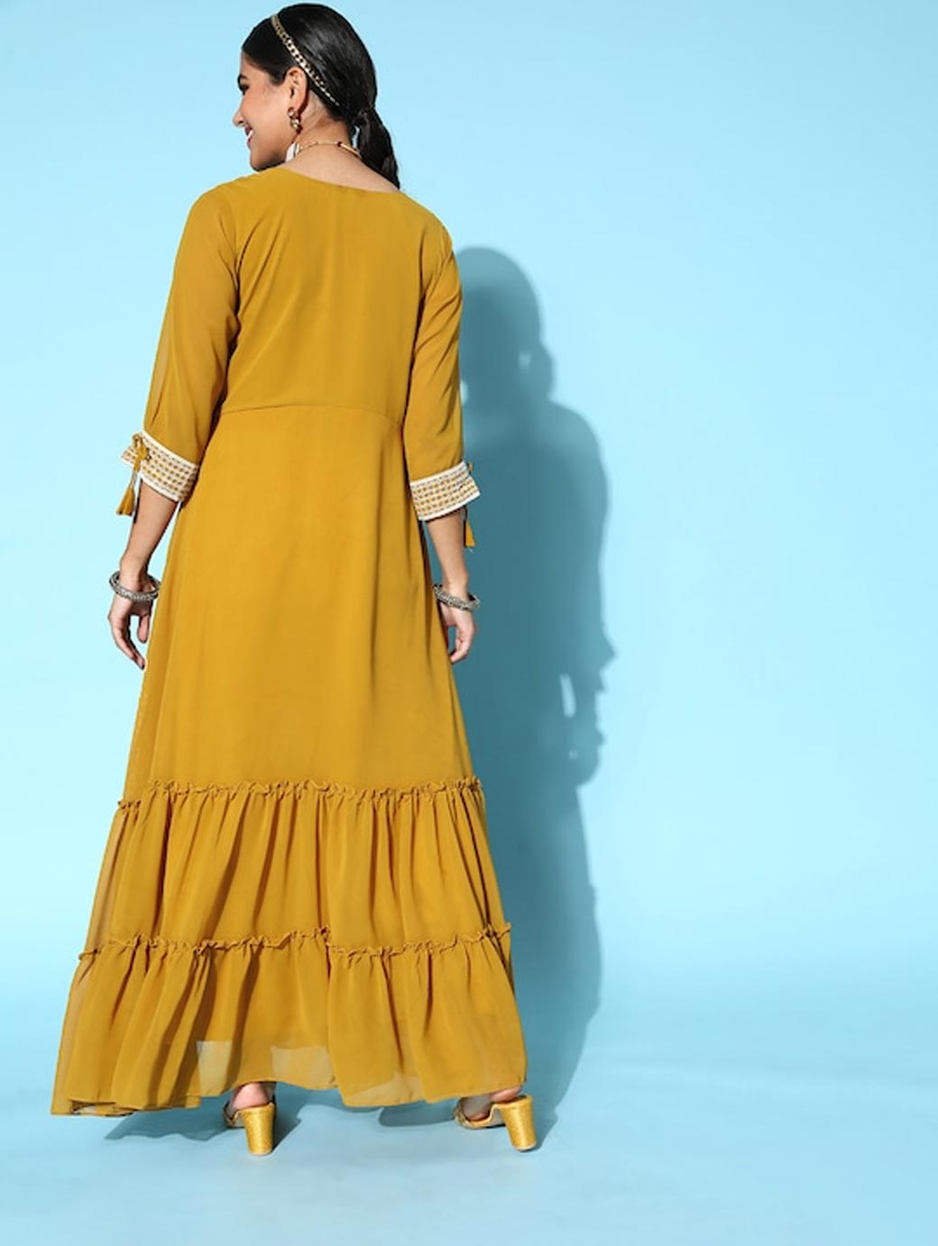Women Bright Mustard Yellow Georgette Sequins Embroidery Party Wear Gown