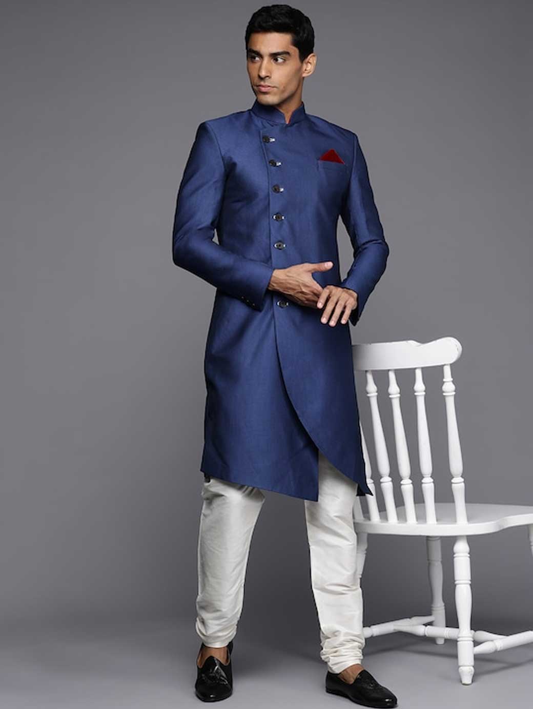 Men Blue & Off White Solid Sherwani Set