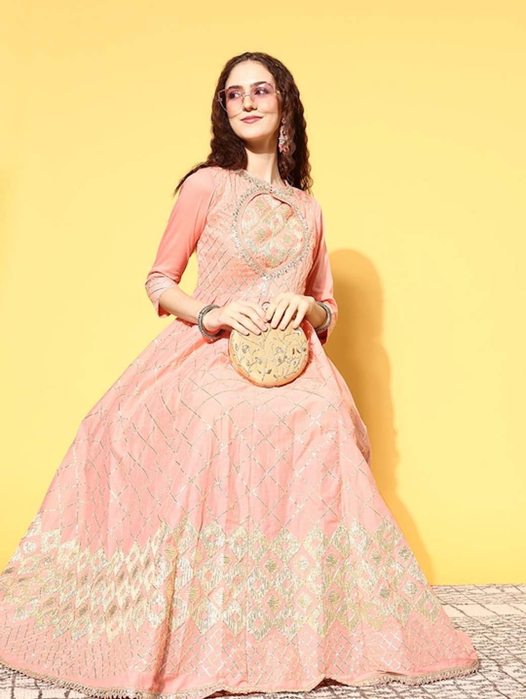 Infuse graceful charm into your ethnic collection with this alluring kurta. It sports lovely three-quarter regular sleeves and a classy flared hemline to lend a gorgeous look. Beautiful peach shade Three-quarter regular sleeves Flared hemline Ankle length Cotton, dry clean Trend Alert Ensembles adorned with glittery embellishments, like sequins or metallic sheen, to lend you a festive vibe. They are paired with uber-stylish detailing, such as spaghetti straps, tiering, wide necklines, pleats, belted details, etc.