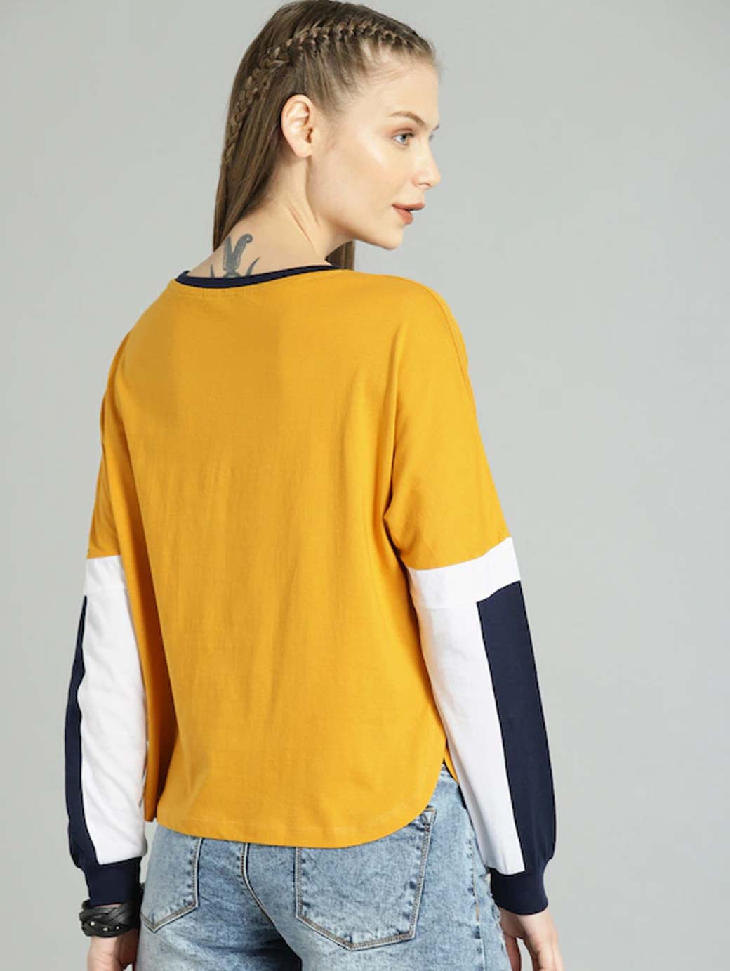Women Yellow Solid Round Neck Knitted Pure Cotton T-shirt